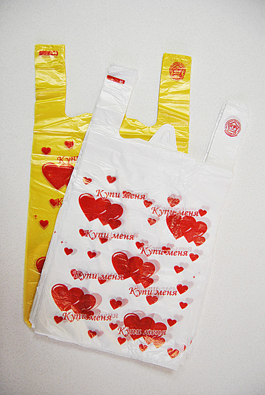 | Пакет-майка Купи меня из материала ПНД (полиэтилен низкого давления) имеет повышенную грузоподъемность, характерно шуршит при смятии. Увеличение внутреннего объема пакета происходит за счет фальцев. Петля позволяет удобно размещать пакеты-майки в кассовой зоне. Используется для упаковки пищевых и непищевых продуктов в супермаркетах, торговых точках прилавочного типа и точках общественного питания |