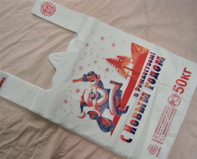 Новогодние пакеты-майки 30х55 см Веселый Дед Мороз из материала ПНД (полиэтилен низкого давления) прекрасно подчеркнут атмосферу долгожданного праздника – Нового года.