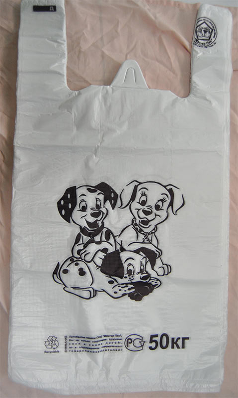 | Пакет-майка Далматинец из материала ПНД (полиэтилен низкого давления) имеет повышенную грузоподъемность, характерно шуршит при смятии. Увеличение внутреннего объема пакета происходит за счет фальцев. Петля позволяет удобно размещать пакеты-майки в кассовой зоне. Используется для упаковки пищевых и непищевых продуктов в супермаркетах, торговых точках прилавочного типа и точках общественного питания |